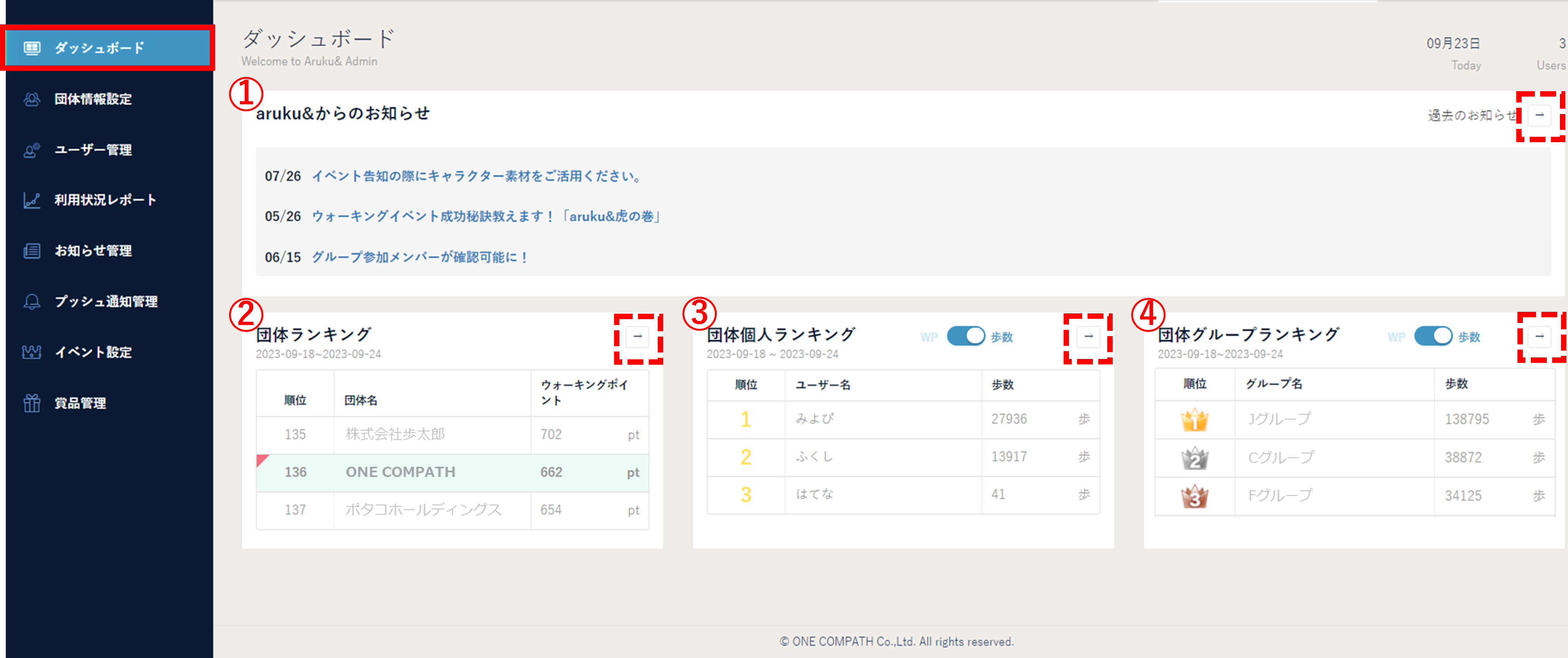 「ダッシュボード」の画面では、団体内のランキングやお知らせを確認することができます。