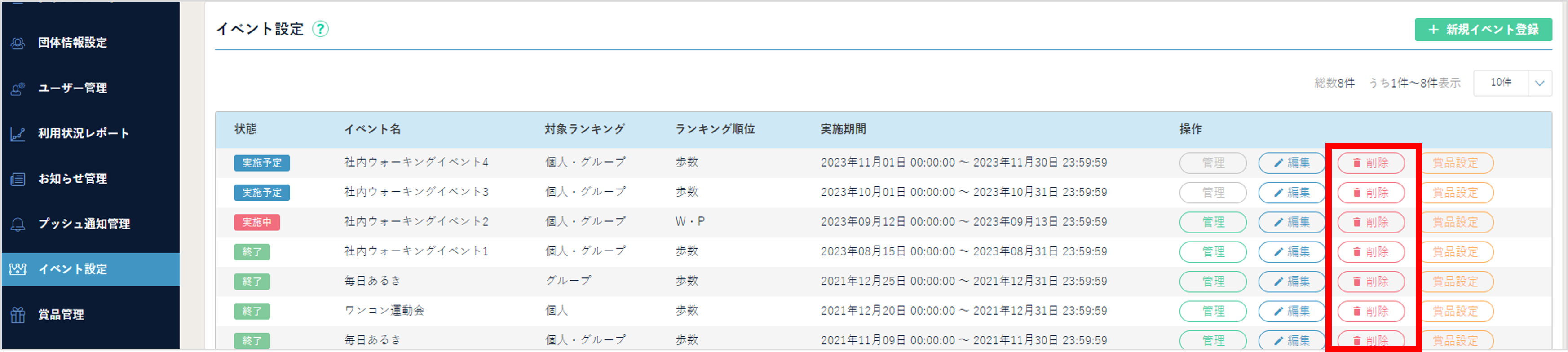 対象イベントの 削除 ボタンから、登録済みのイベント情報を削除することができます。