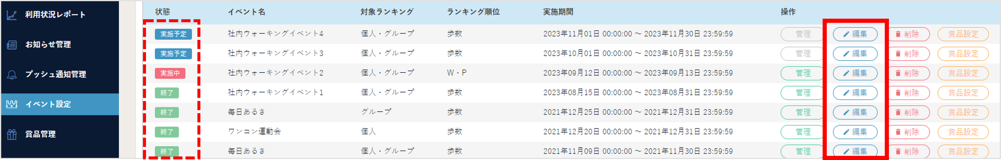 対象イベントの 編集 ボタンから、登録済みのイベント情報を編集することができます。
