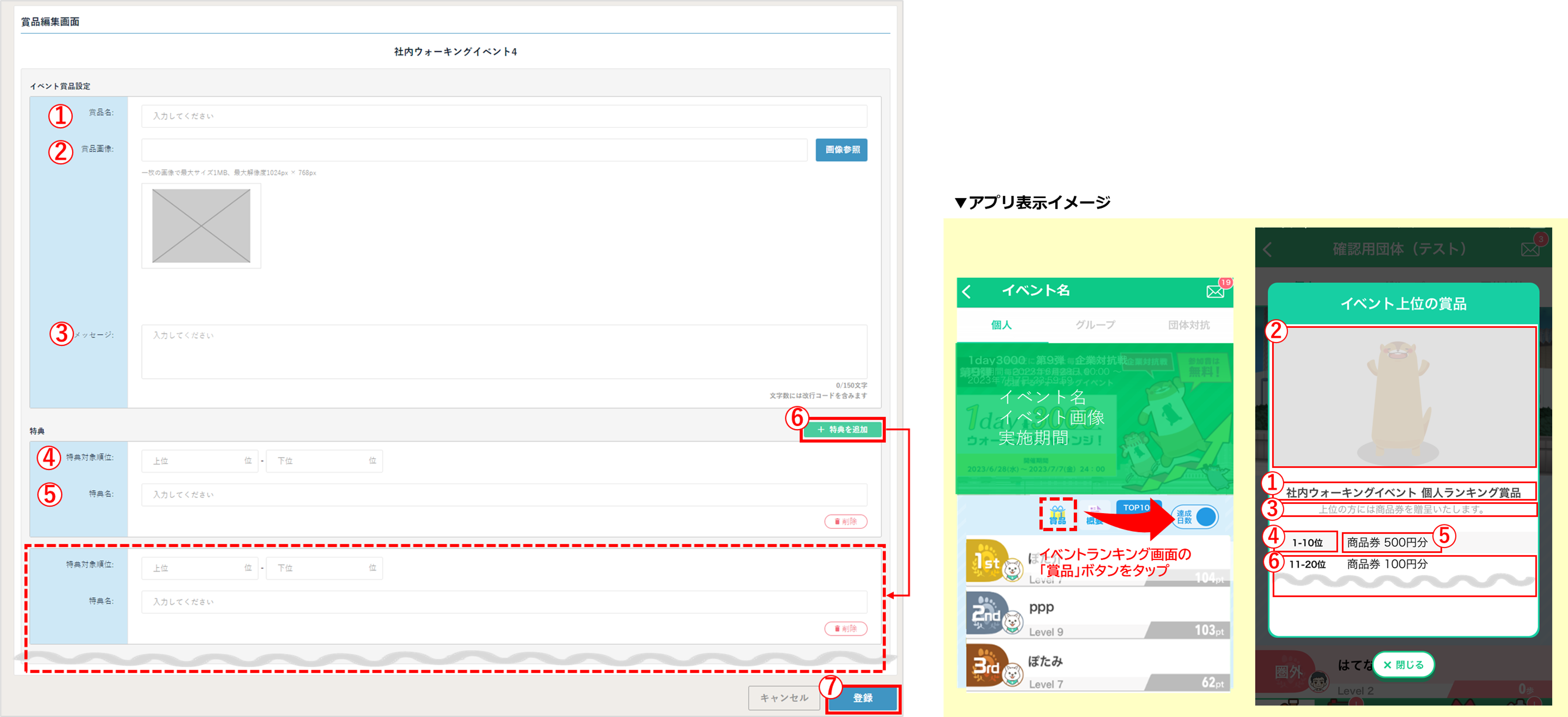 こちらの機能は、アプリ内のイベントランキングに賞品を『掲載(告知)』する機能です。