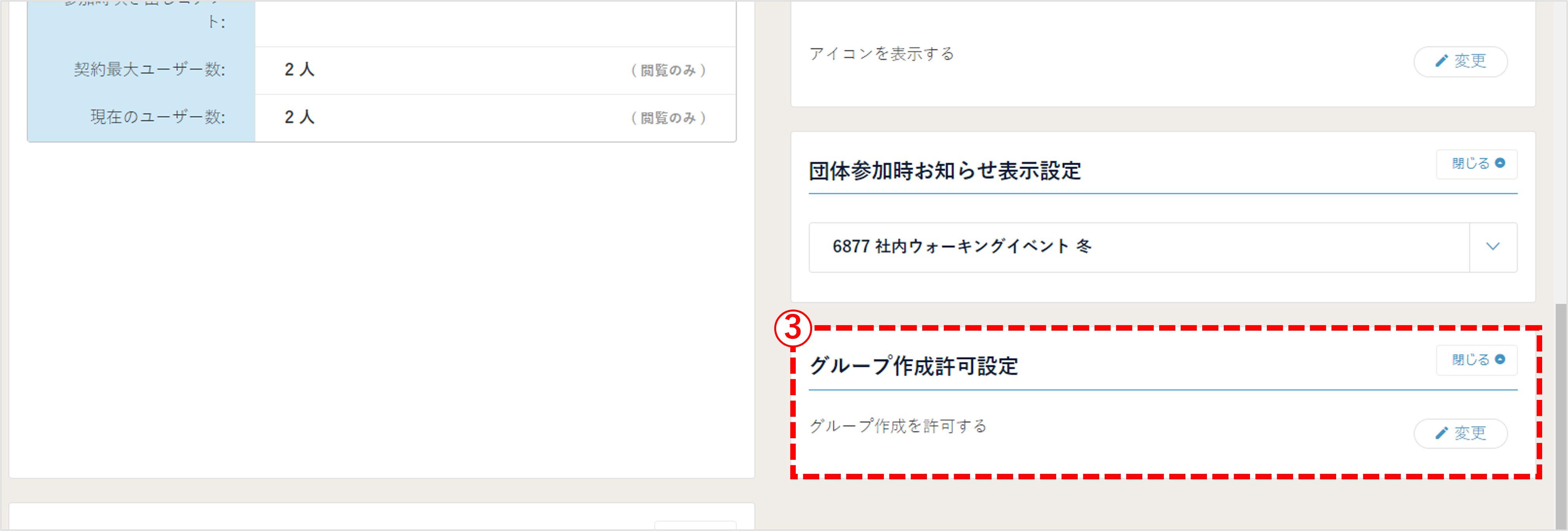 (2)「③ グループ作成許可設定 」の 『変更』ボタンを押下してください。