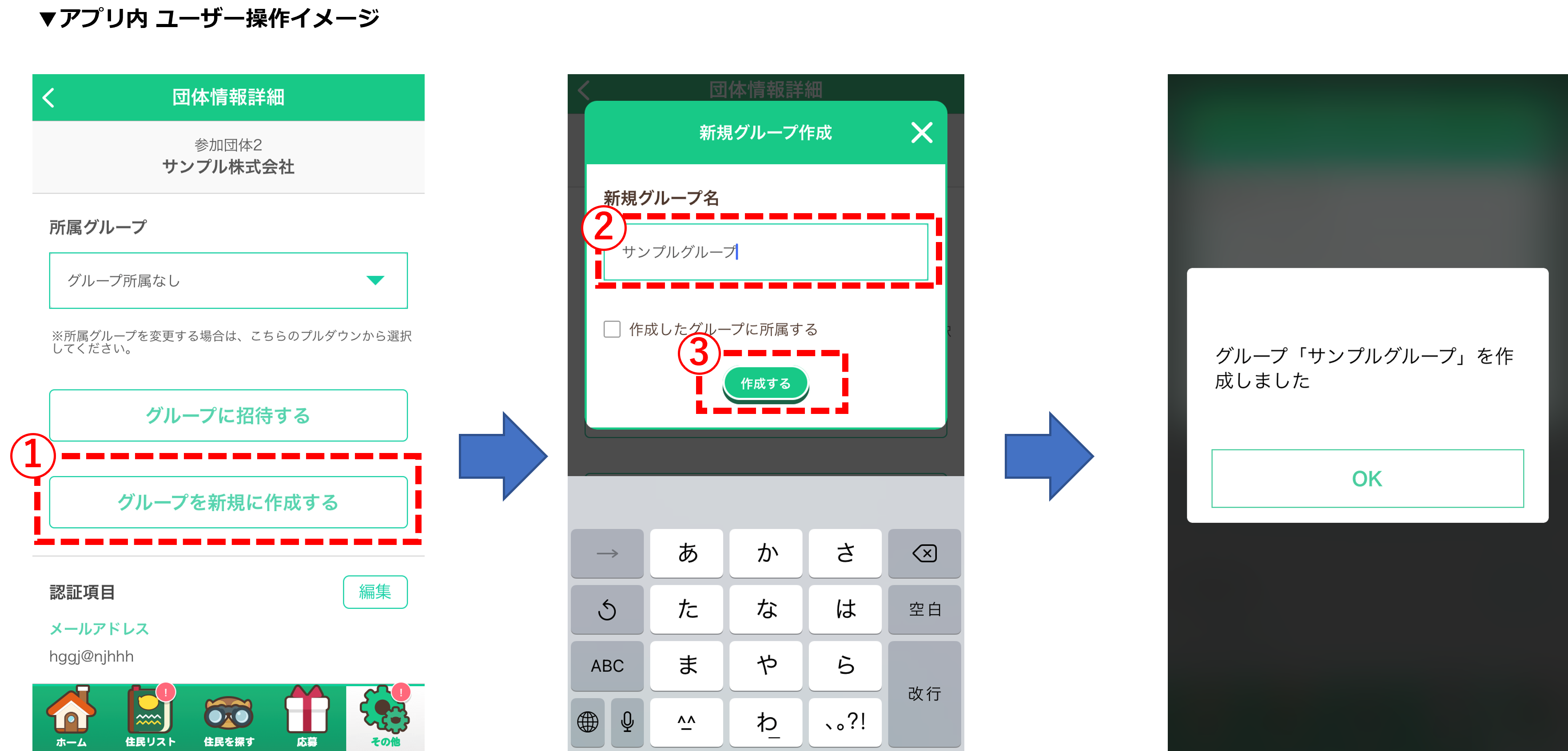 2. ② に任意のグループ名を入力し、「③ 作成する 」をタップ