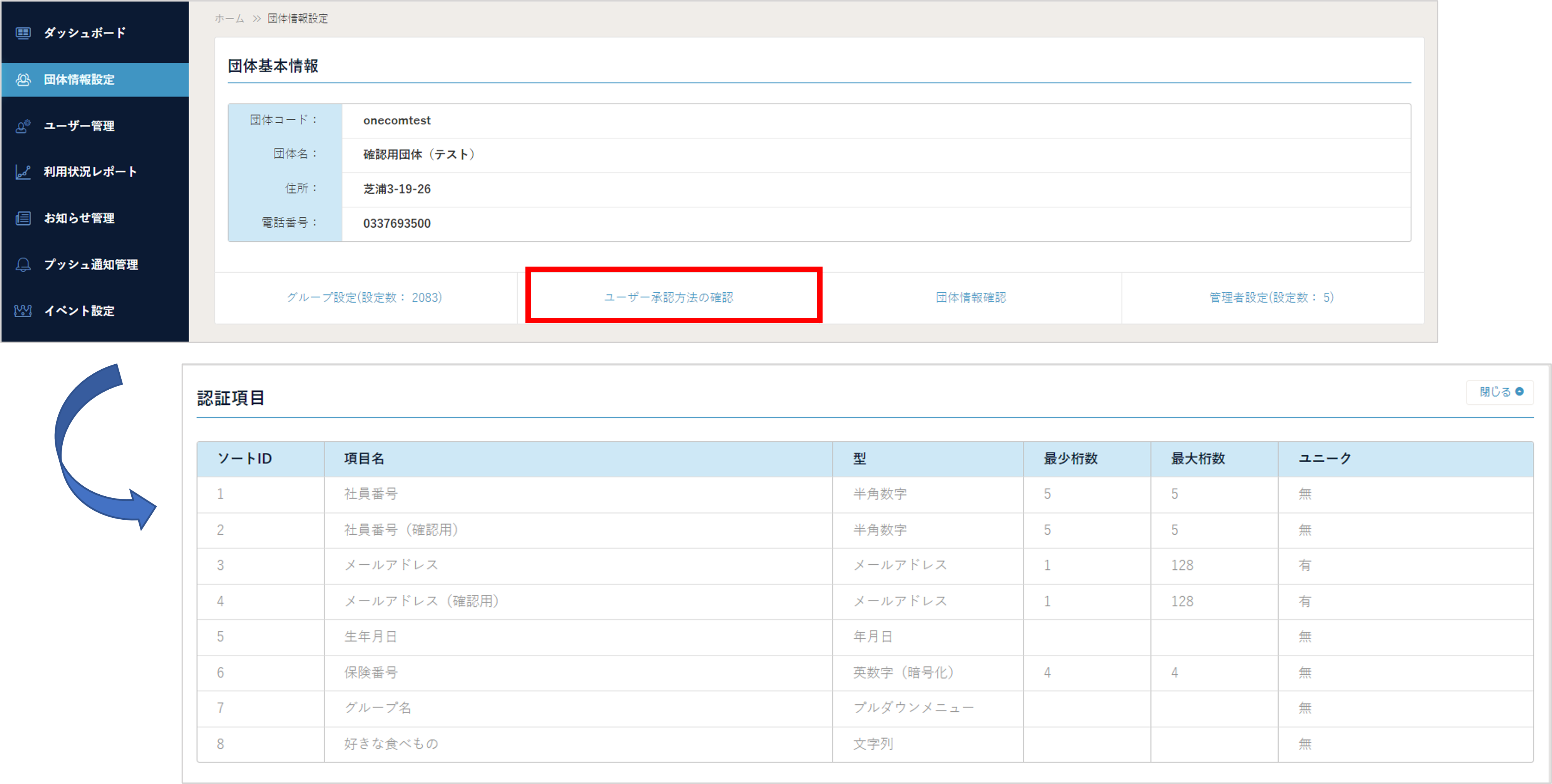 団体情報確認の”ユーザー承認方法の確認” では、団体に設定中の “認証項目” を確認することができます。