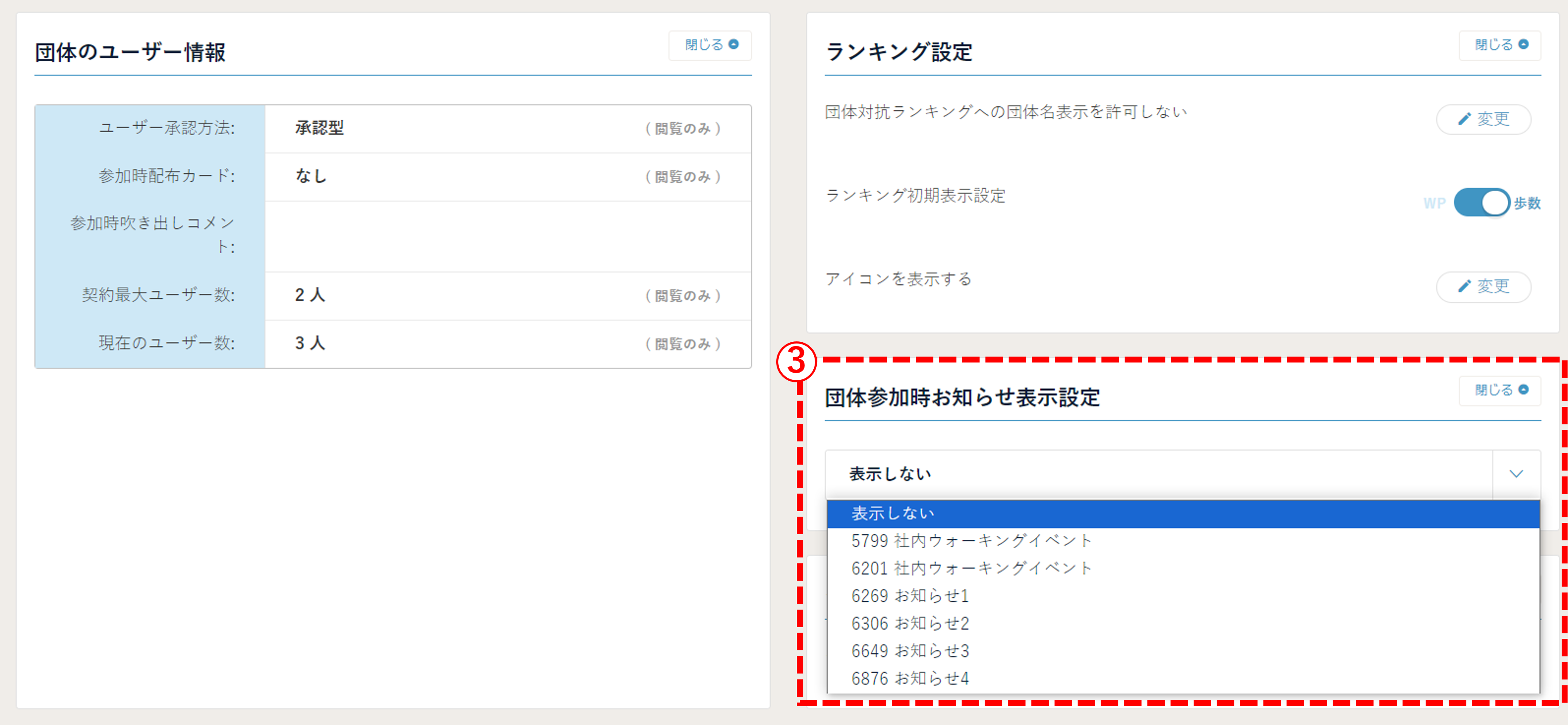 (2)「③ 団体参加時のお知らせ表示設定 」から、団体参加時にユーザーの画面に表示させたいお知らせを選択してください。