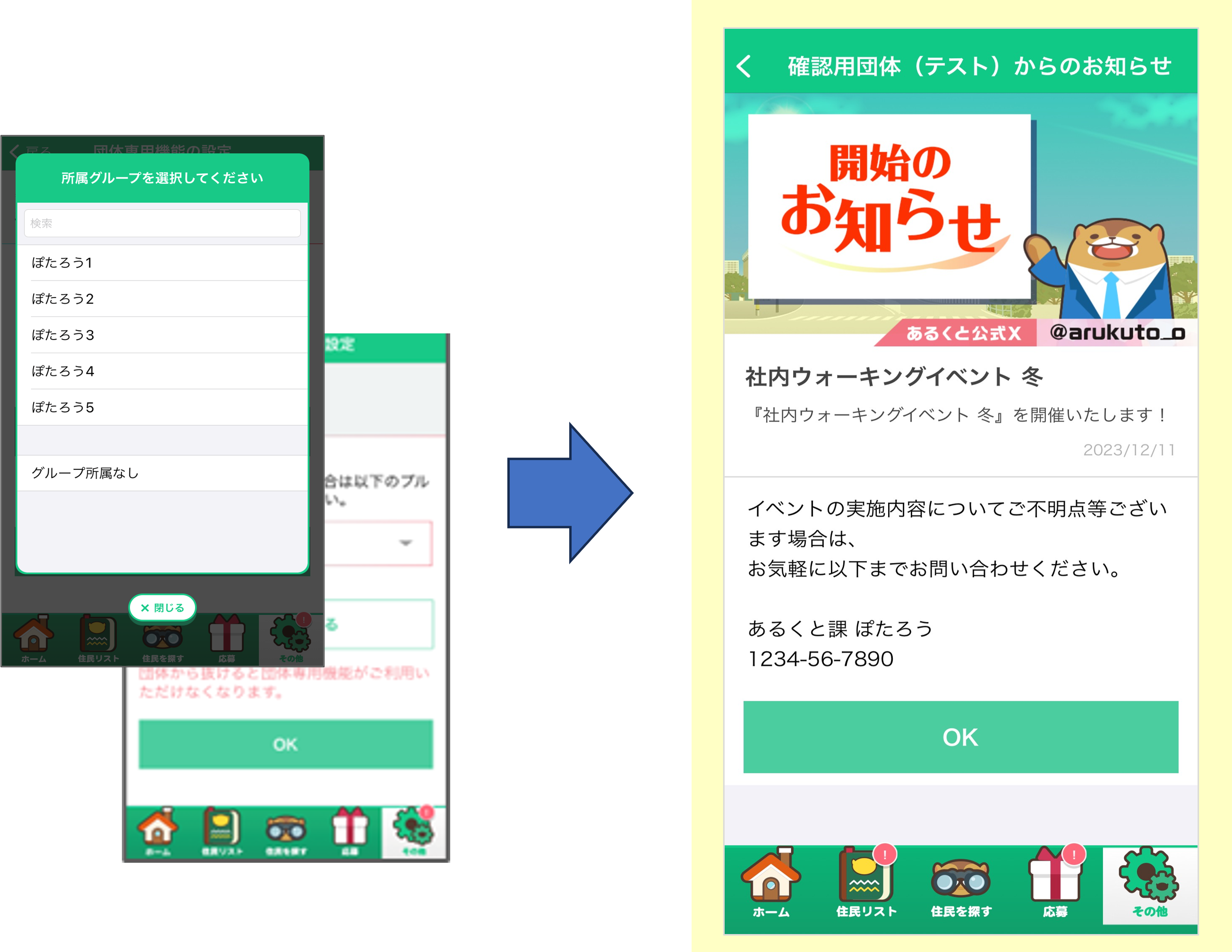 団体情報確認の “団体参加時お知らせ表示設定” の項目では、団体参加時のグループ選択画面の後に表示させるお知らせを選択することができます。