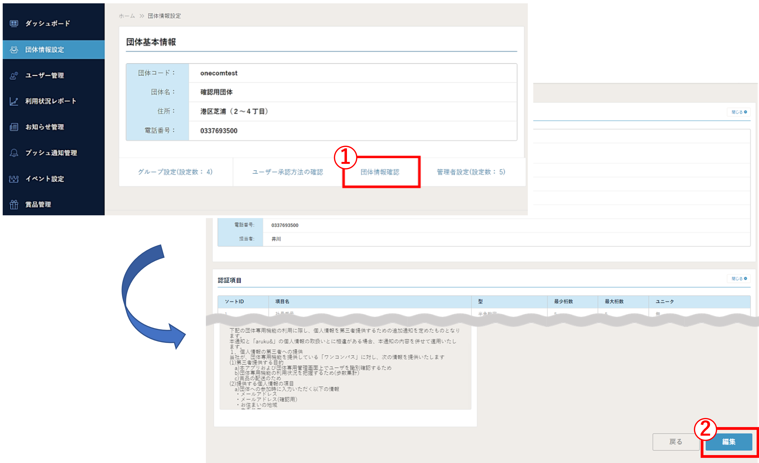 (1) メニューの “団体情報設定” から「① 団体情報確認 」を押下すると、現在の設定を確認できます。