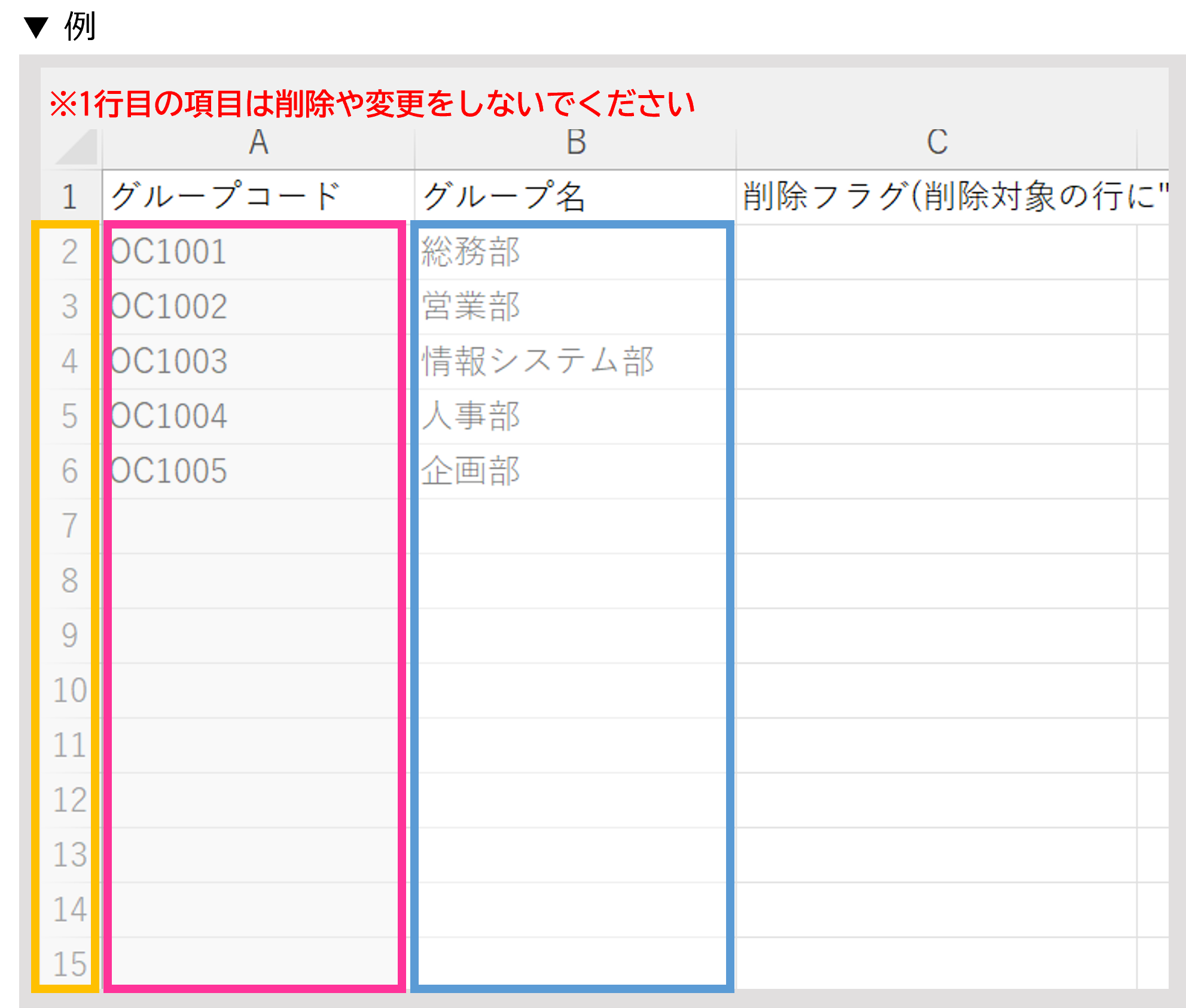 | ■ 行番号 | ■ グループコード(A列) | ■ グループ名(B列) | ■ 削除フラグ(C列) |
