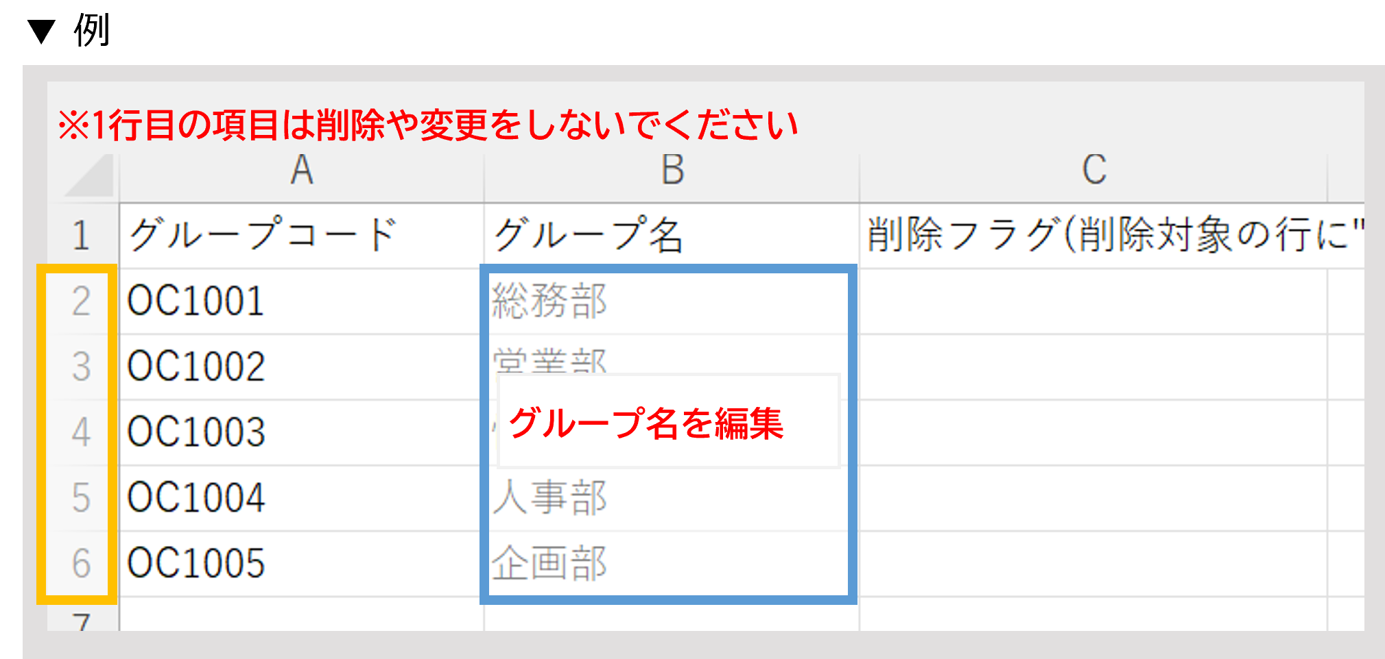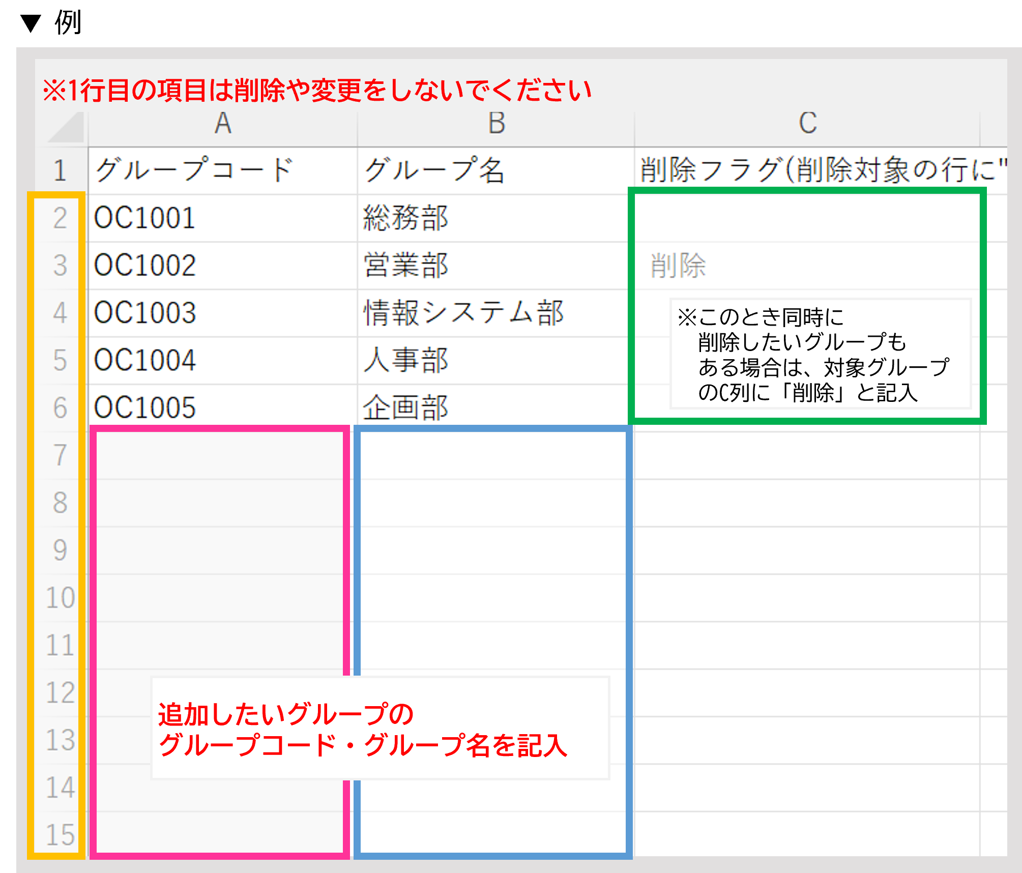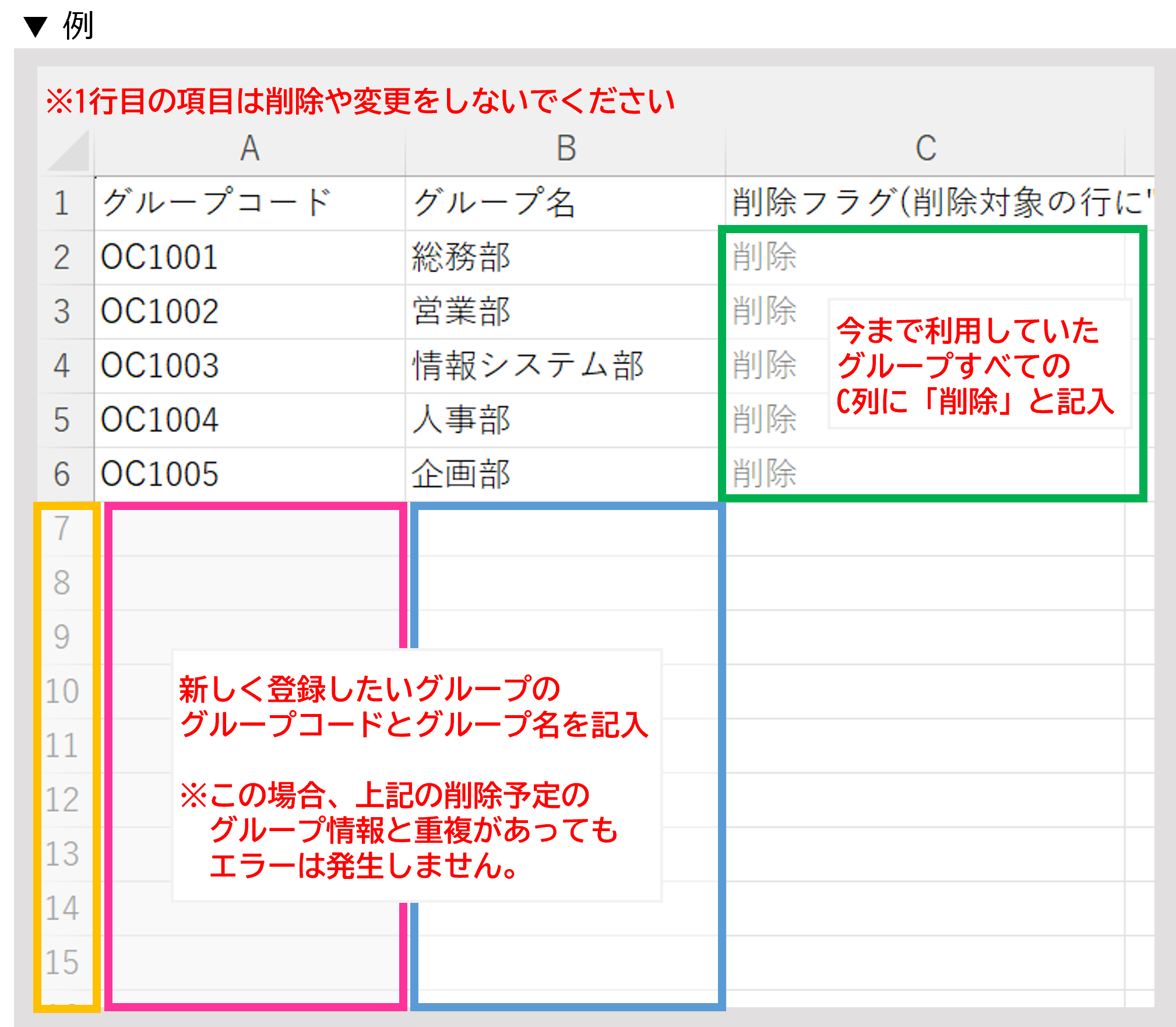 現在のグループ情報のC列に”削除”を入力し、新しい行以降に新規で追加するグループ情報を入力後、(3)の手順へ進んでください。