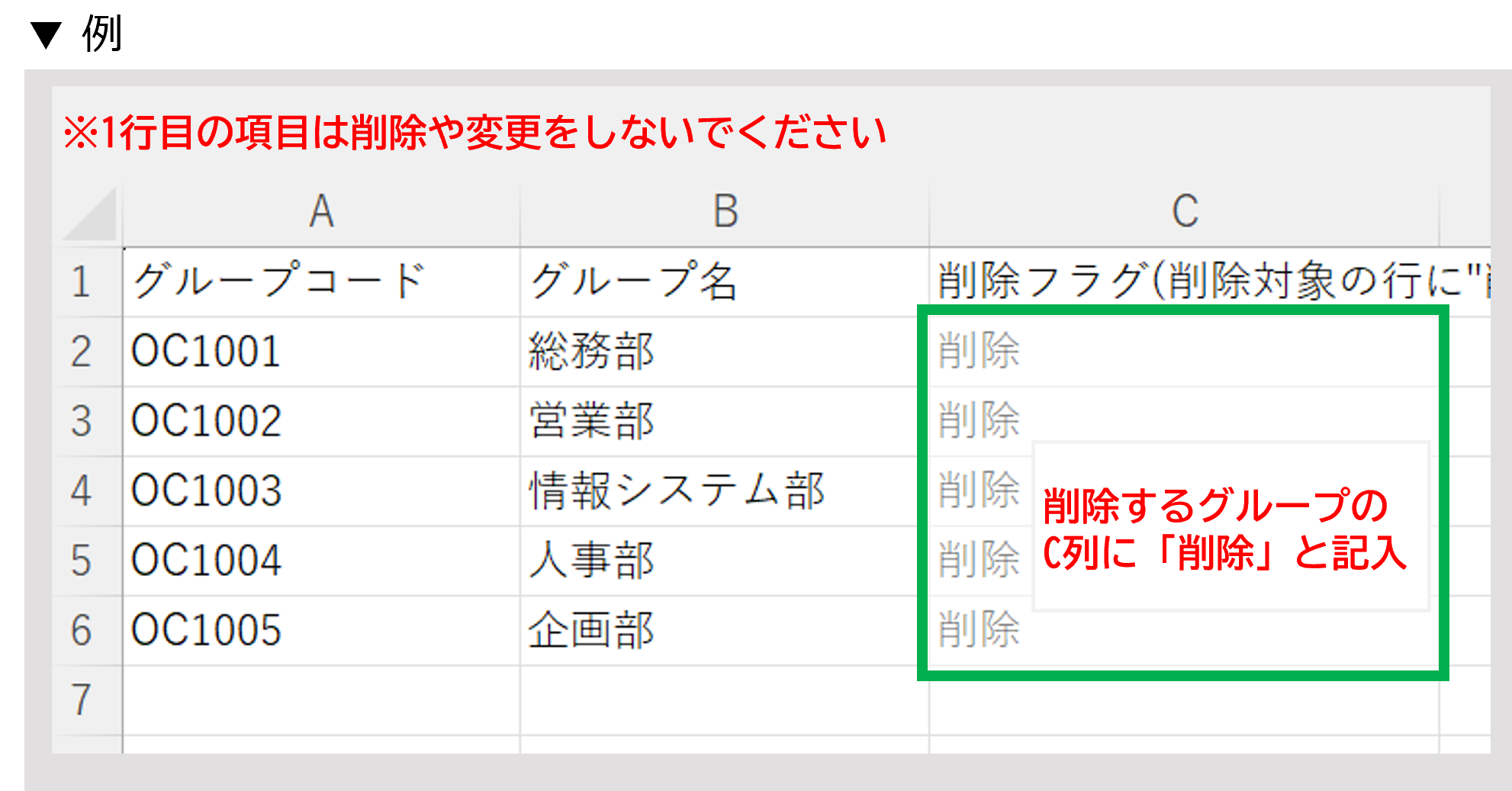 削除したいグループのC列に”削除”を入力し、(3)の手順へ進んでください。