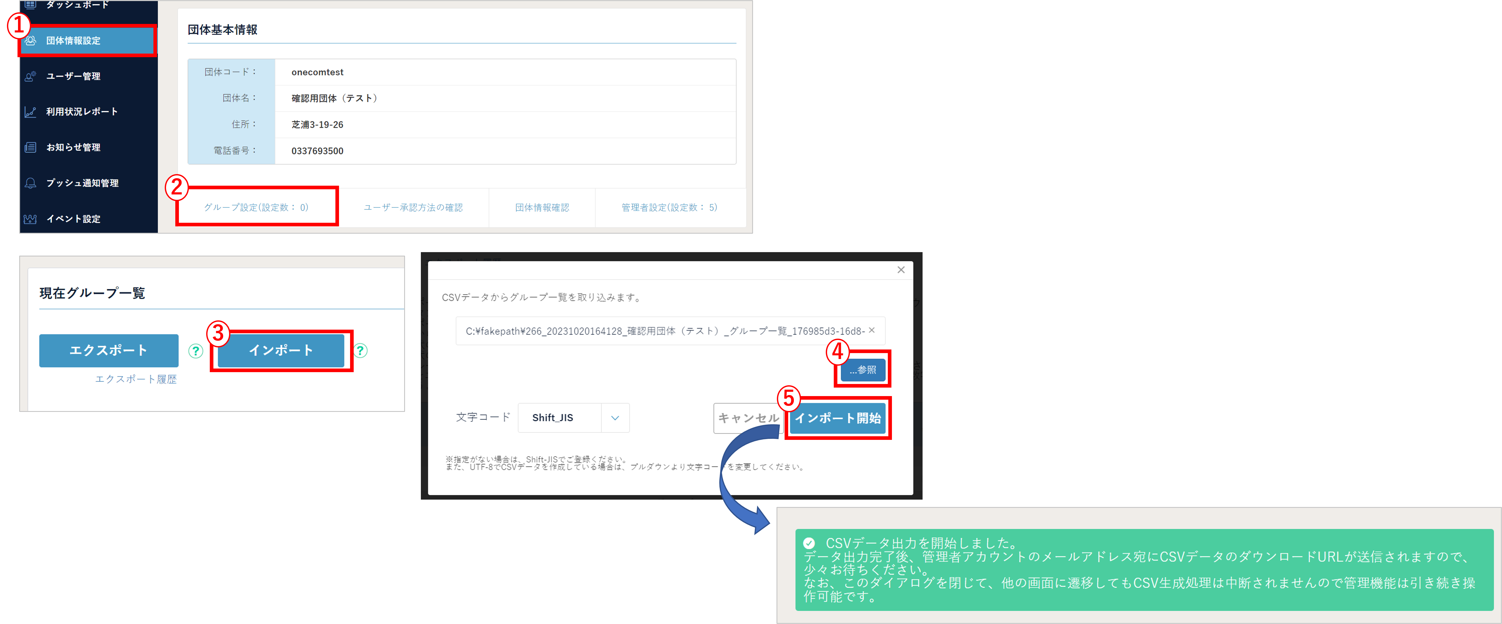 (3) CSVファイルを保存後、 団体情報設定>グループ設定>インポートから作成したCSVを選択し、”インポート開始”を押してください。