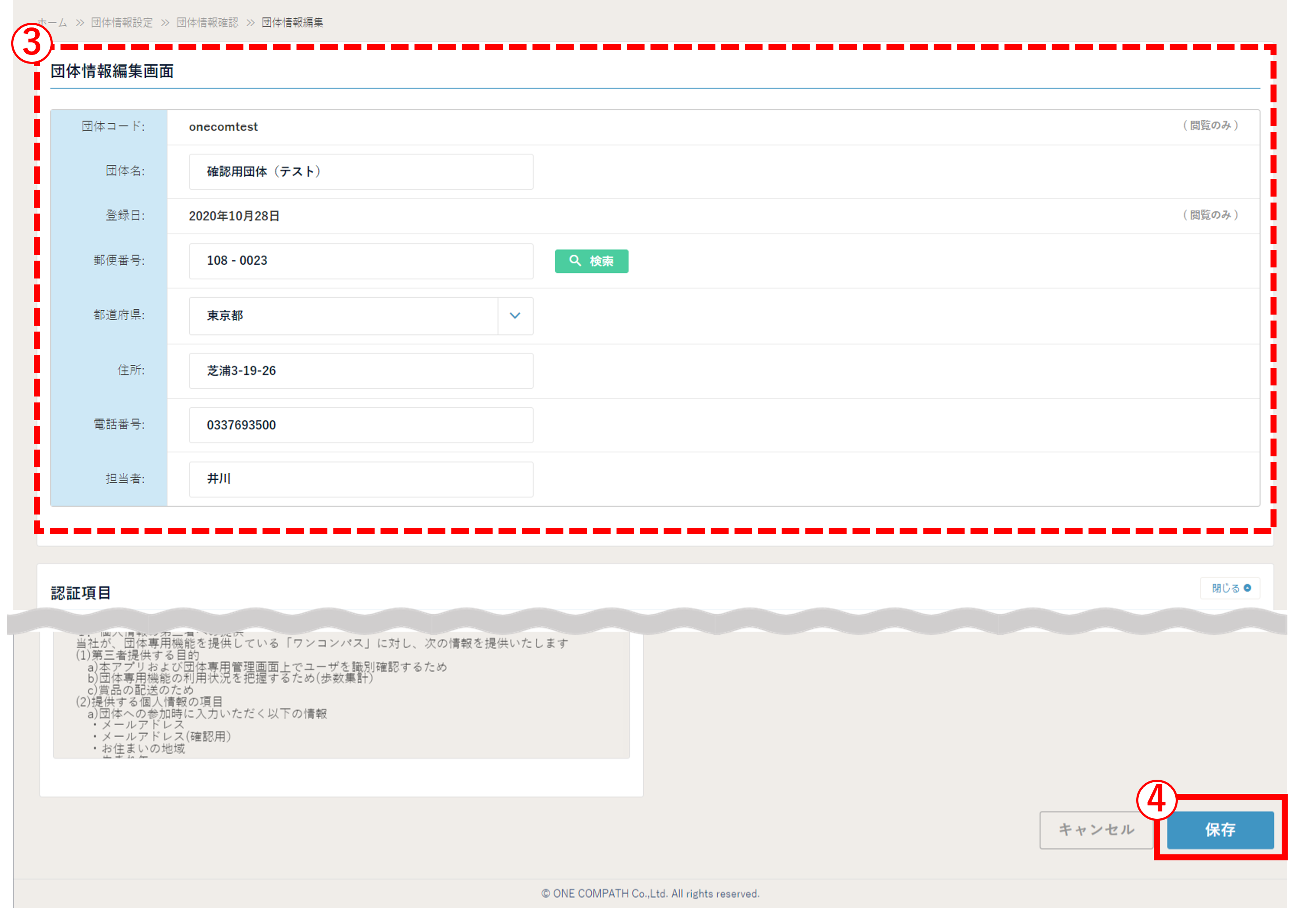 (2) 「③団体情報編集画面 」の該当項目を修正し、最後に「④ 保存 」を押下してください。