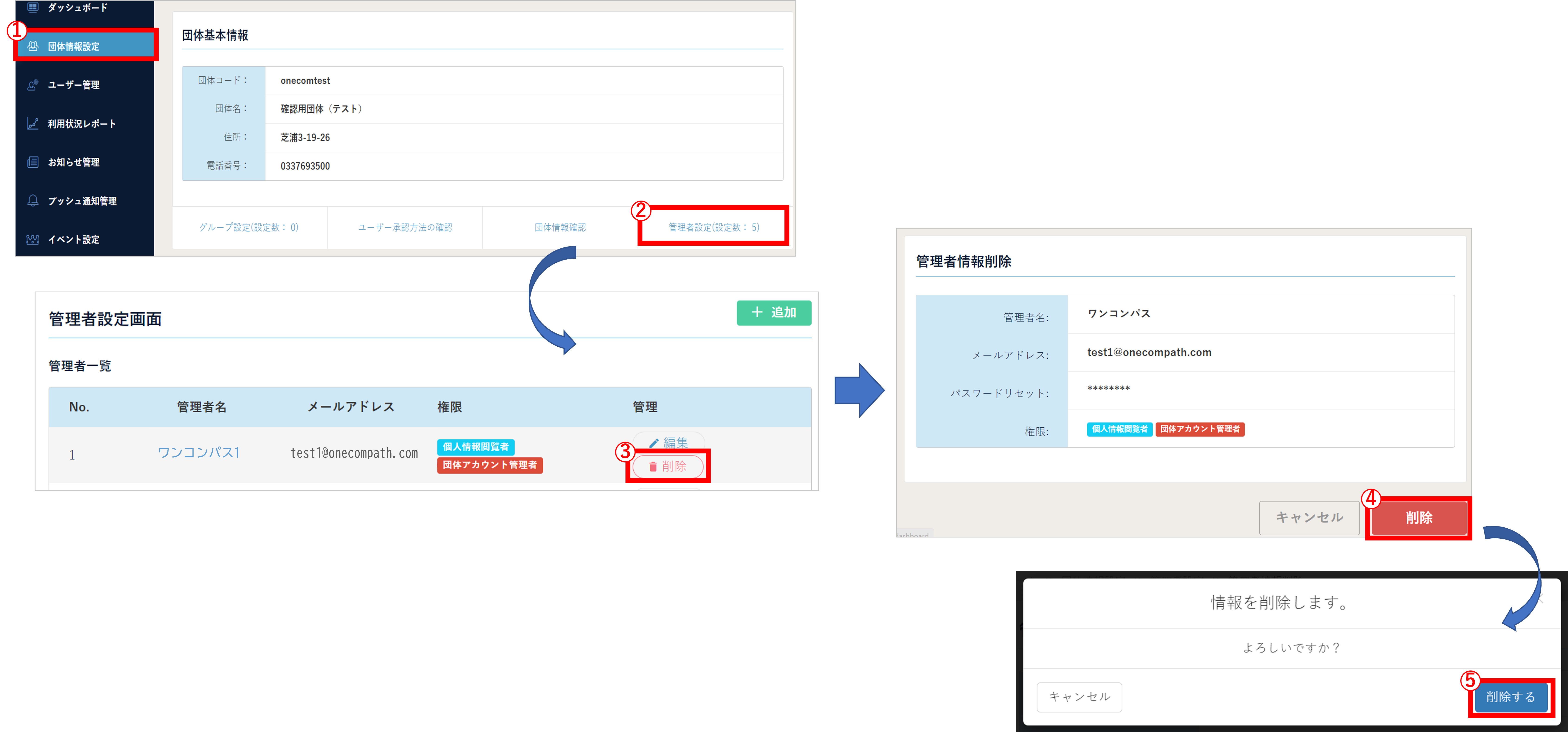 (2) 対象アカウントの「③ 削除」を選択して表示された情報をご確認のうえ、問題なければ「 ④削除」>「⑤ 削除する」を押してください。