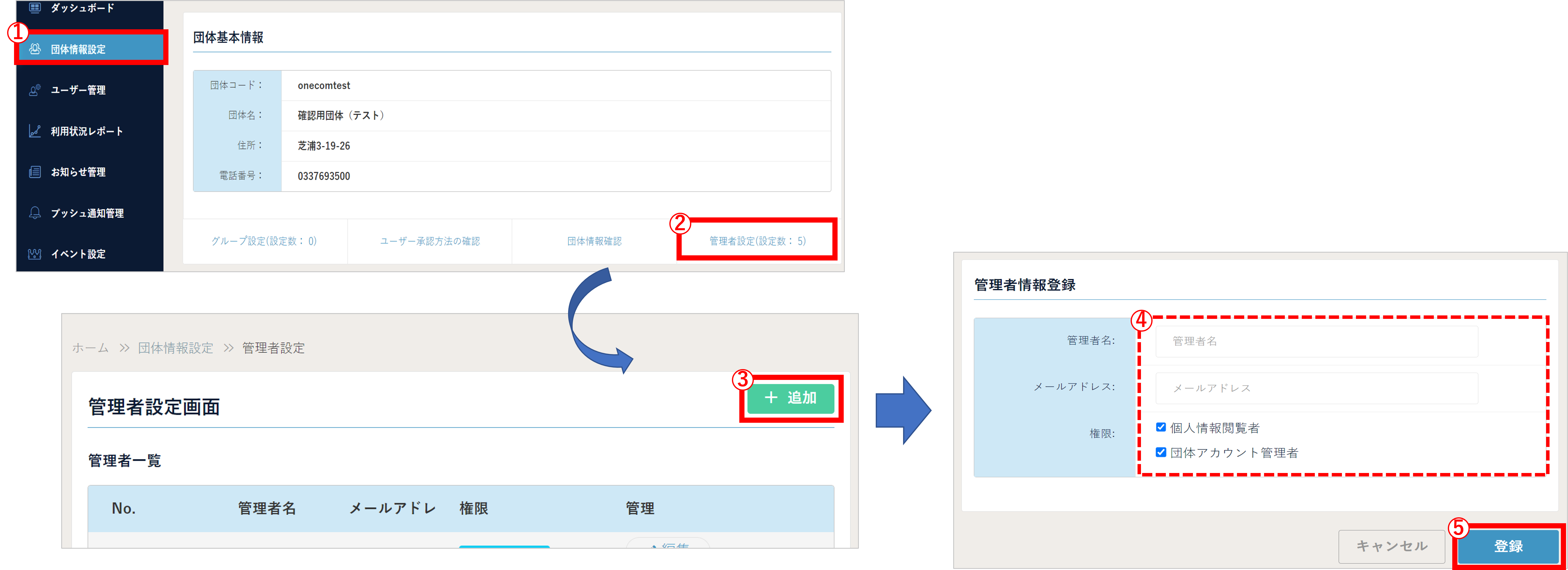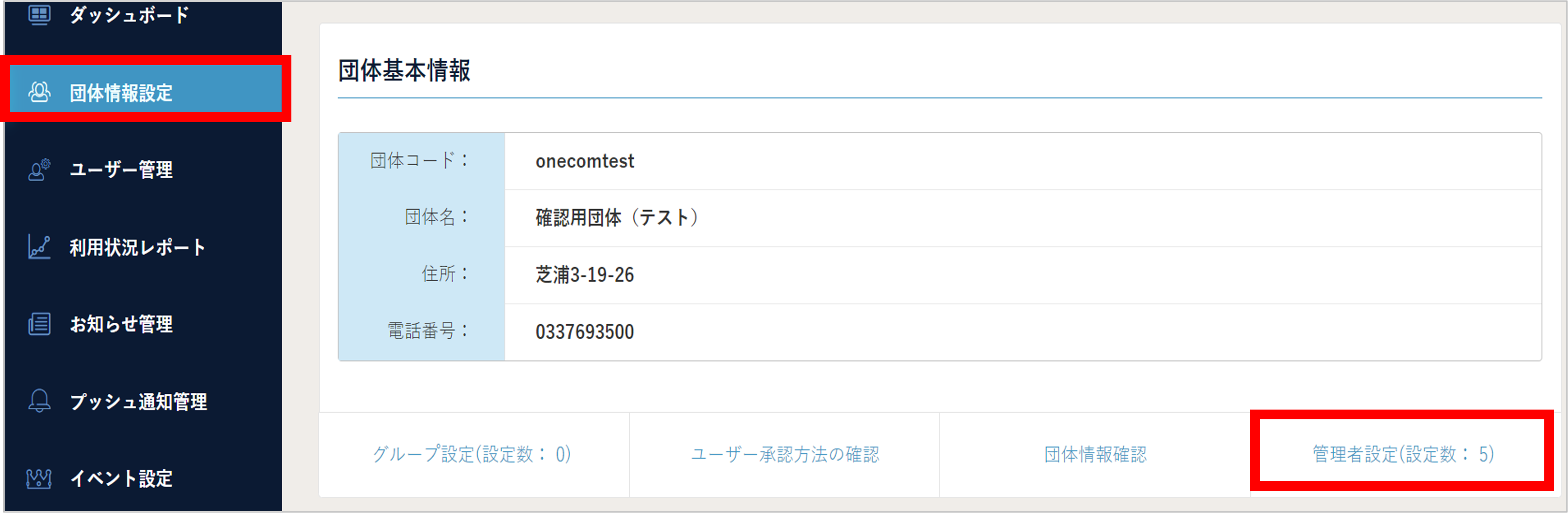 「団体情報設定」の ”管理者設定” からは下記の操作を行うことができます。