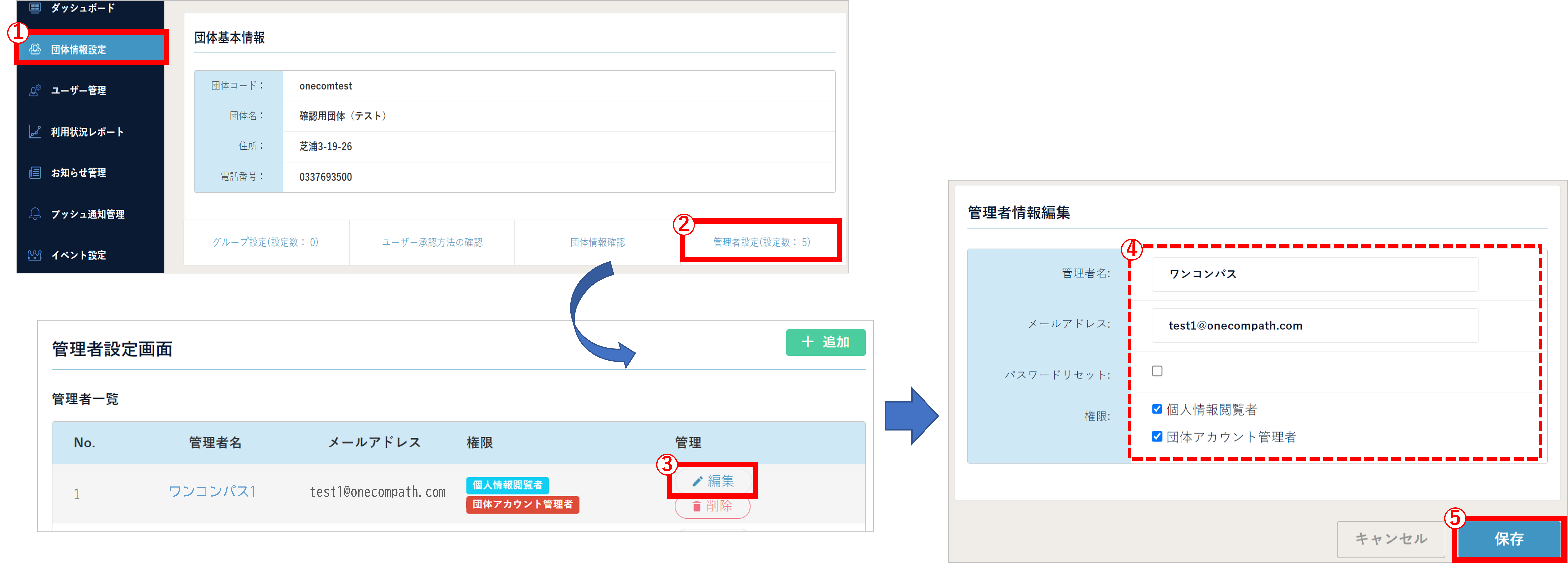 (2) 対象アカウントの「③ 編集」を選択して④の情報を修正後、「⑤ 保存」を押してください。