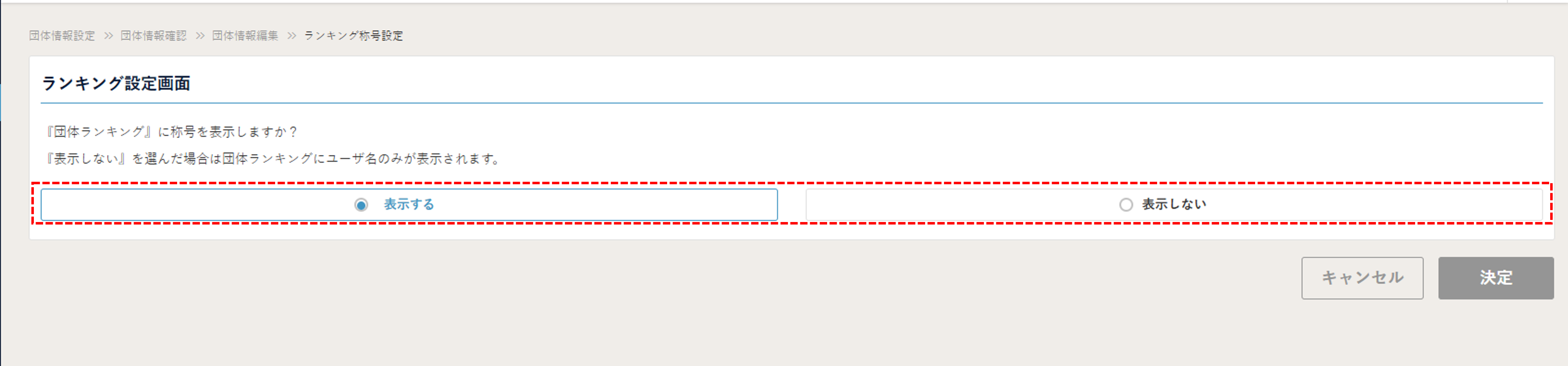 団体情報確認の “ランキング設定” からは、団体内ランキングの表示設定や団体対抗ランキングへの参加可否を確認・編集することができます。