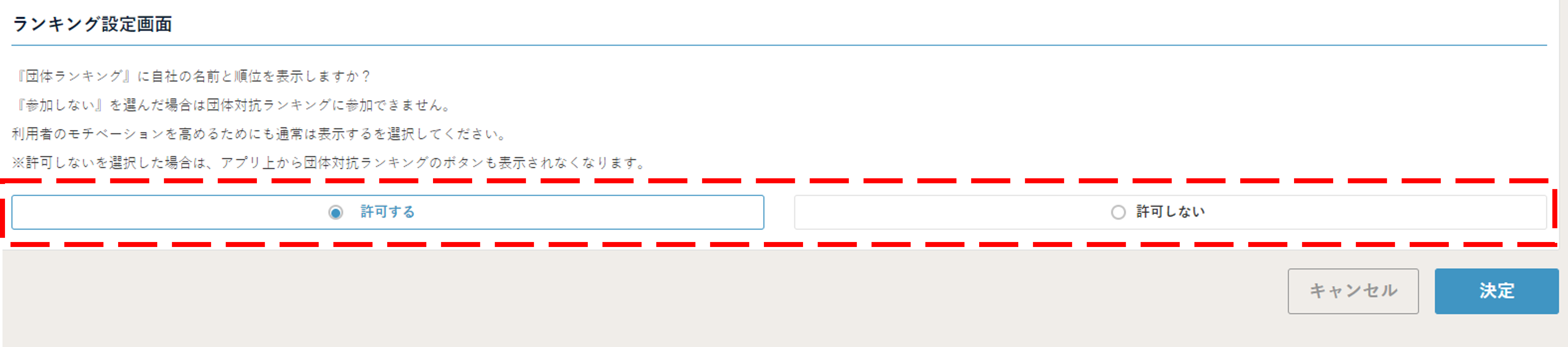 ※許可しないを選択した場合は、アプリ上から団体対抗ランキングのボタンも表示されなくなります。