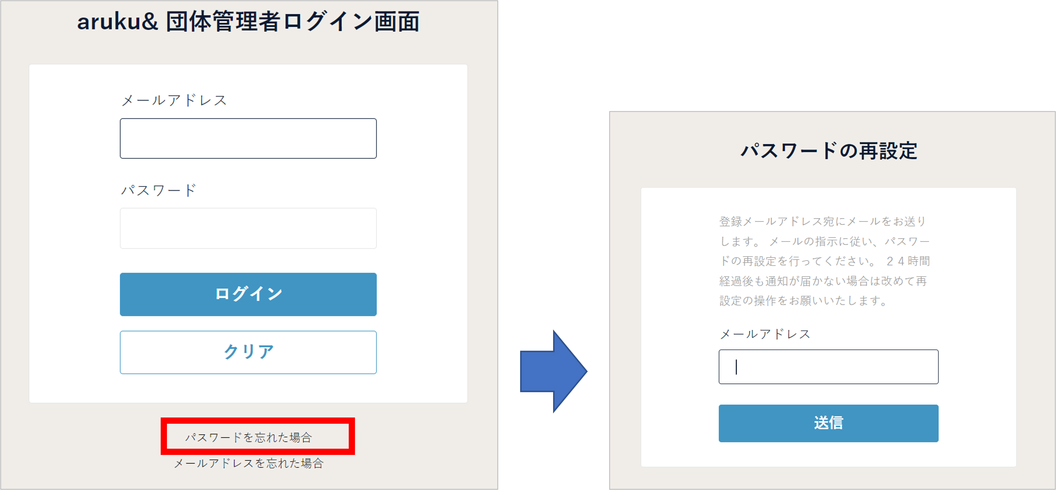 ログイン画面下部の「パスワードを忘れた場合」をクリックし、 管理者アカウントに登録したメールアドレスを記入ください。
