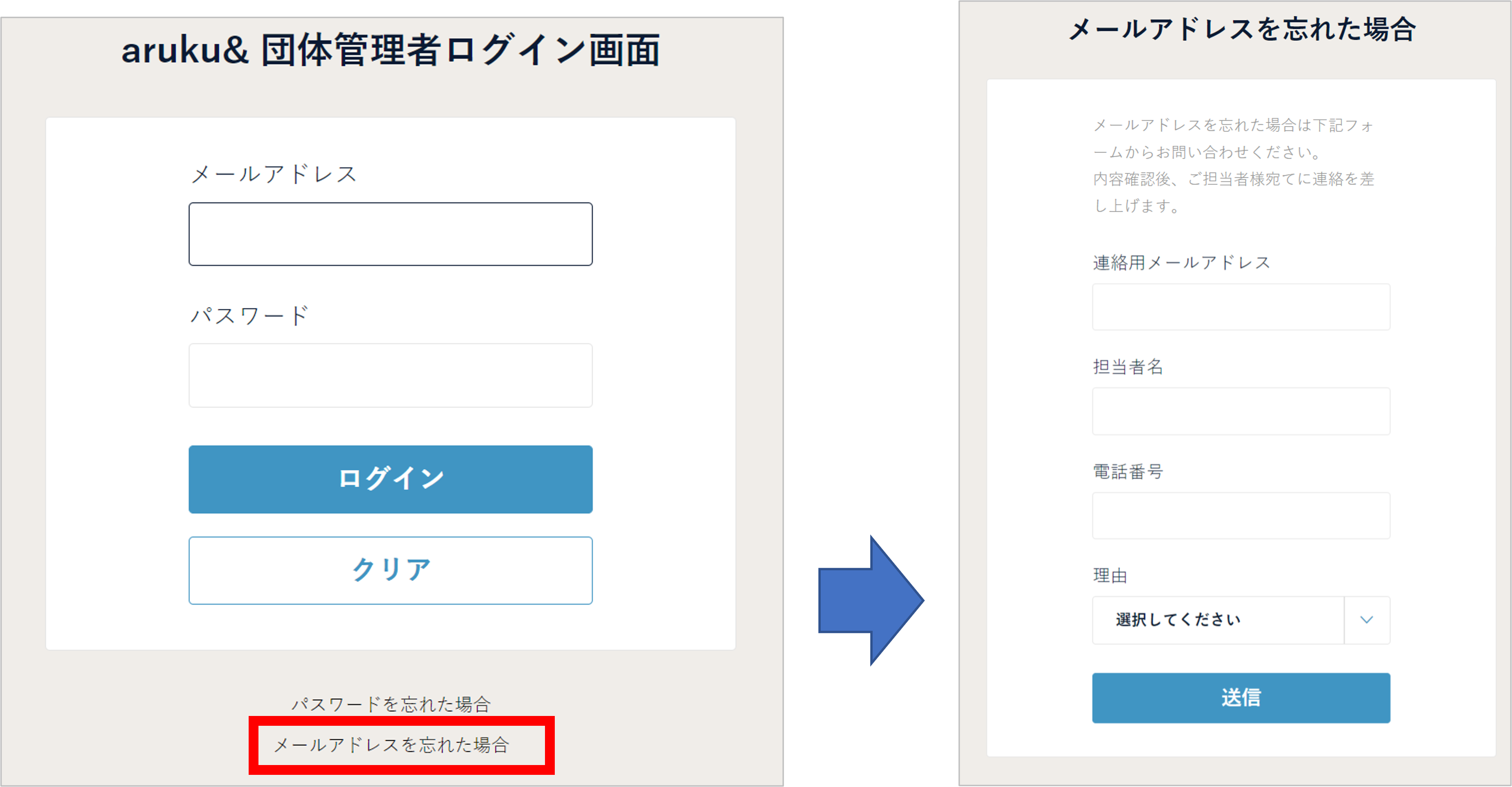 ログイン画面下部の「メールアドレスを忘れた場合」をクリックし、問い合わせフォームよりご連絡ください。
