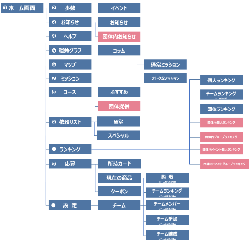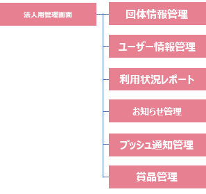 aruku&団体管理機能は以下の機能群で構成されています。赤い色の機能が団体管理機能に含まれる機能となります。