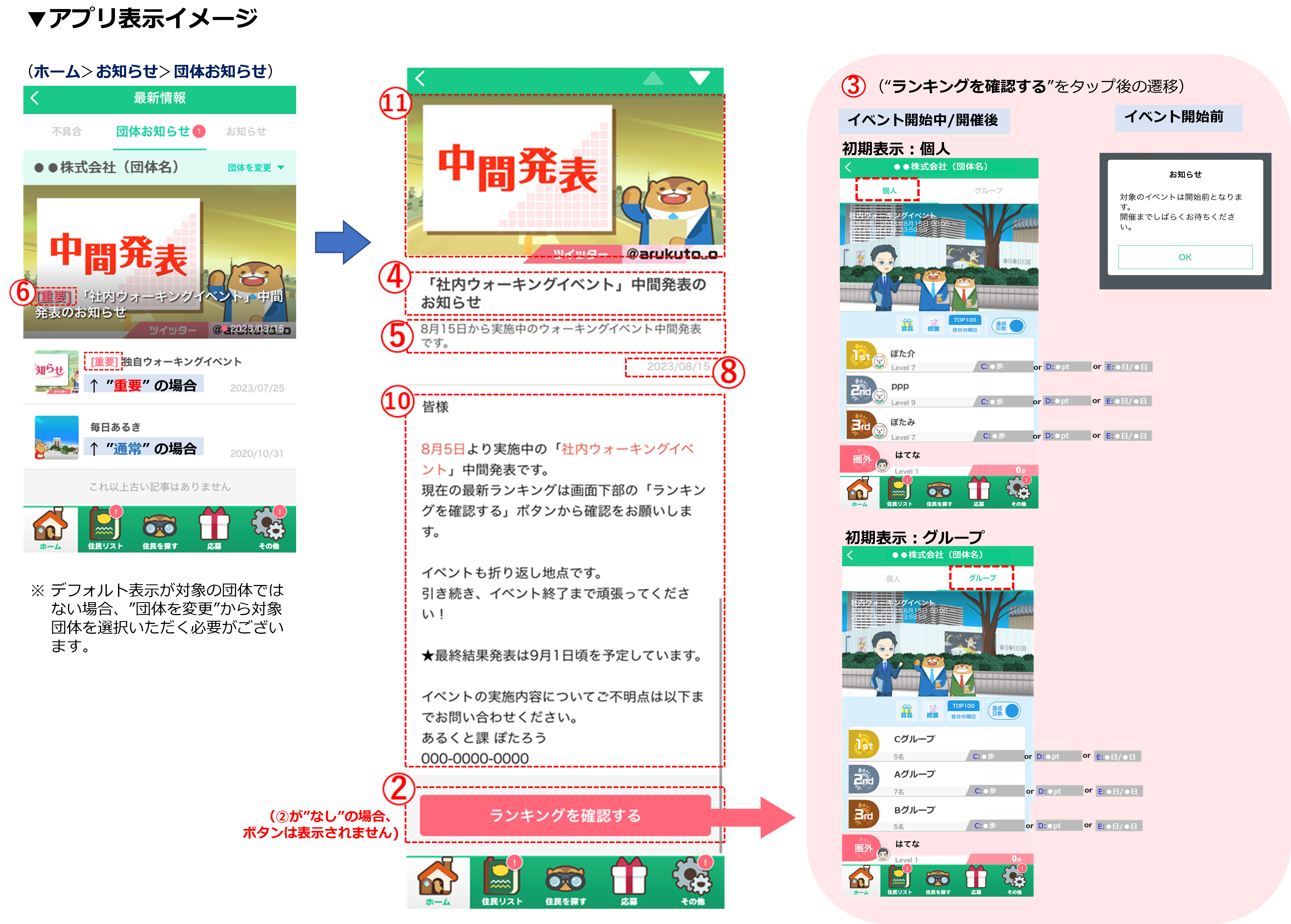 団体内お知らせ画面を開いた際、記事TOP画像と併せて表示されます。