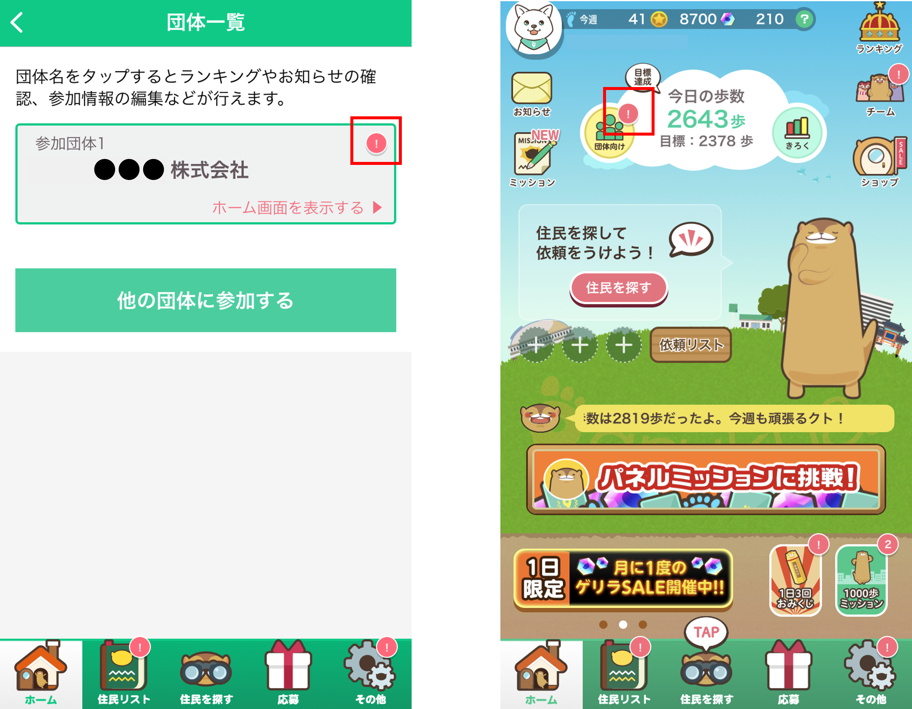 新規でお知らせを配信もしくは、未読の団体チャットがあると、アプリ上では以下の場所に未読のお知らせ/団体チャットがあることを通知する赤いマークが表示されます。