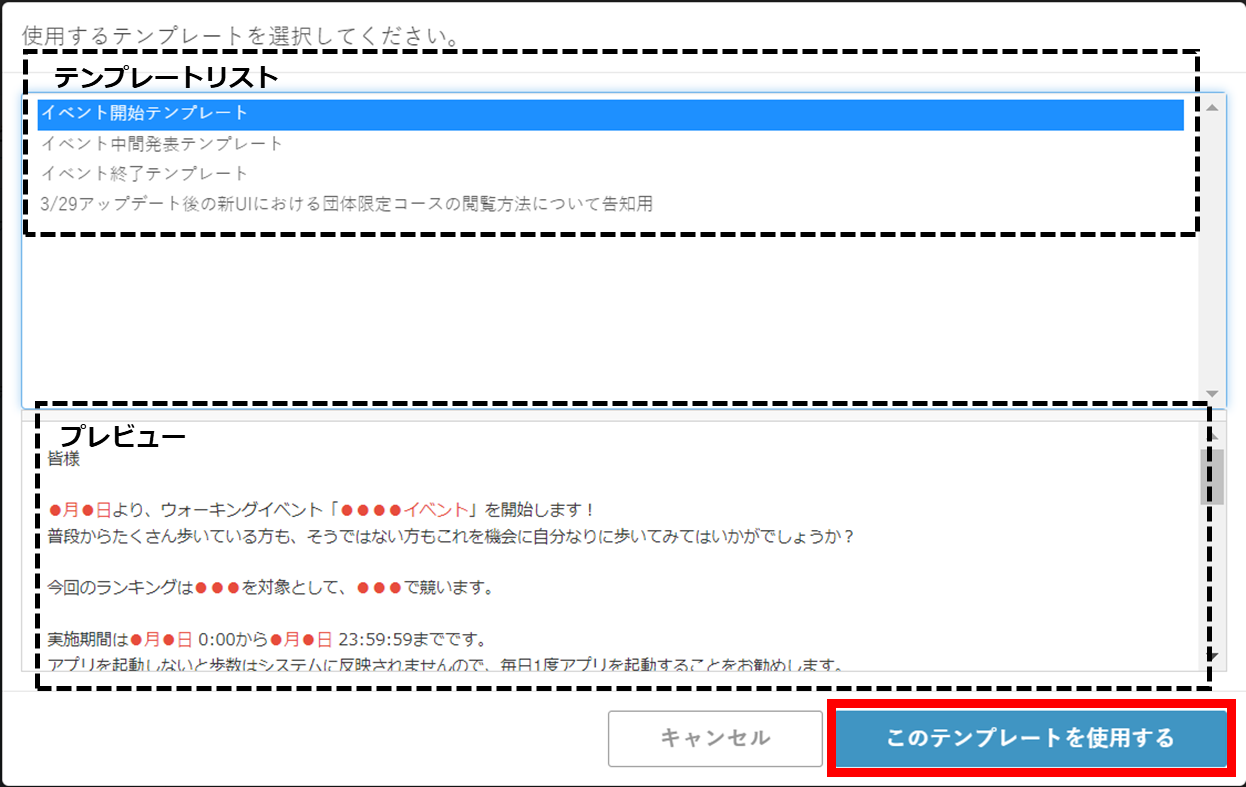 (※) ①でテンプレートを設定している場合、”●●●イベント” や “●月●日” の部分を選択したイベントの名称や開催日時に置き換えることができます。