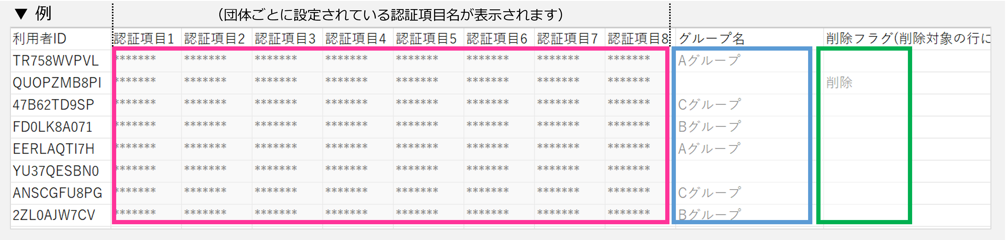 | 変更しないようご注意ください。 | 変更したい認証項目の入力内容を 上書きで修正してください。 | 所属グループを変更したい場合は、 上書きで修正してください。 | 団体から削除したいユーザーがいる 場合は、” 削除 ” を入力してください。 |