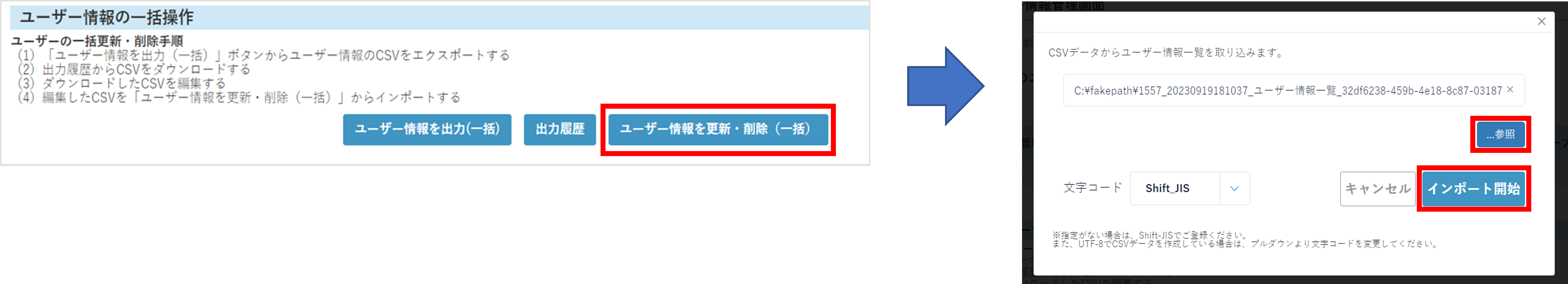(3)『ユーザー管理』の “ユーザー情報を更新・削除(一括)” から編集したCSVを選択し、インポートします。