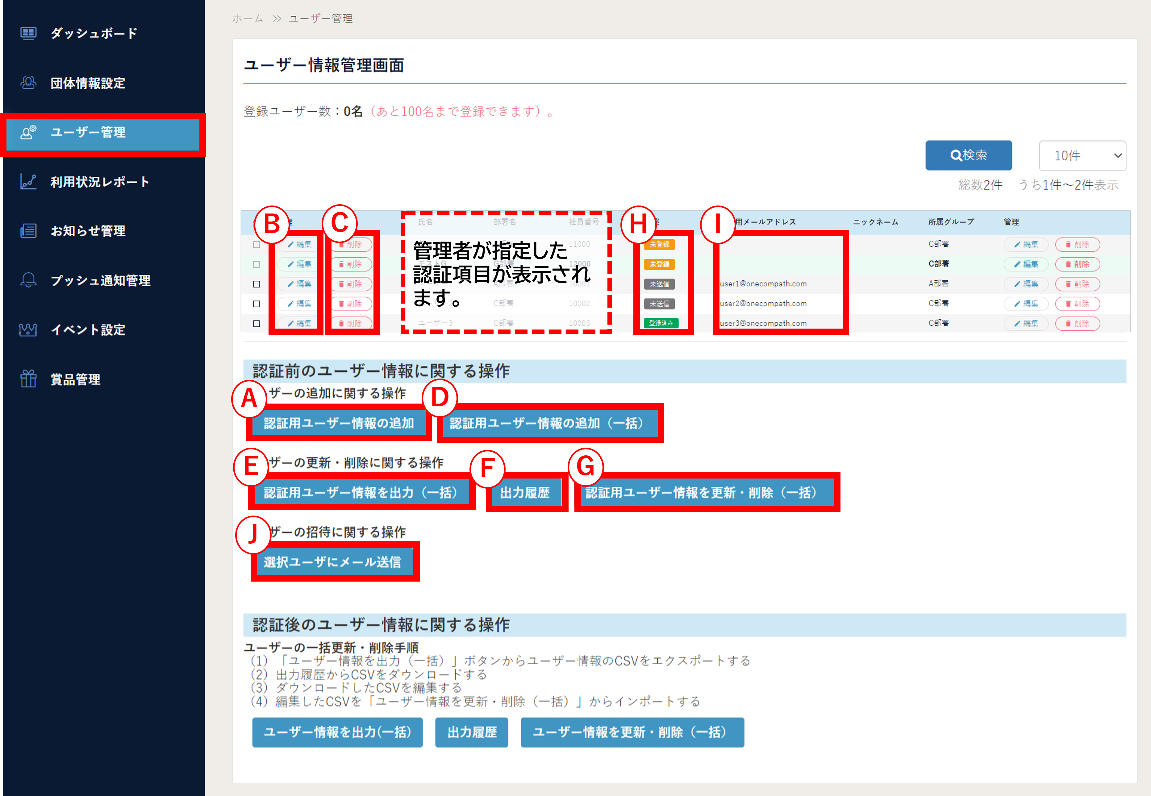 ※ 『認証前』のユーザーは、「(H) 状態 」のステータスが『未登録』『未送信』『送信済み』のユーザーです。