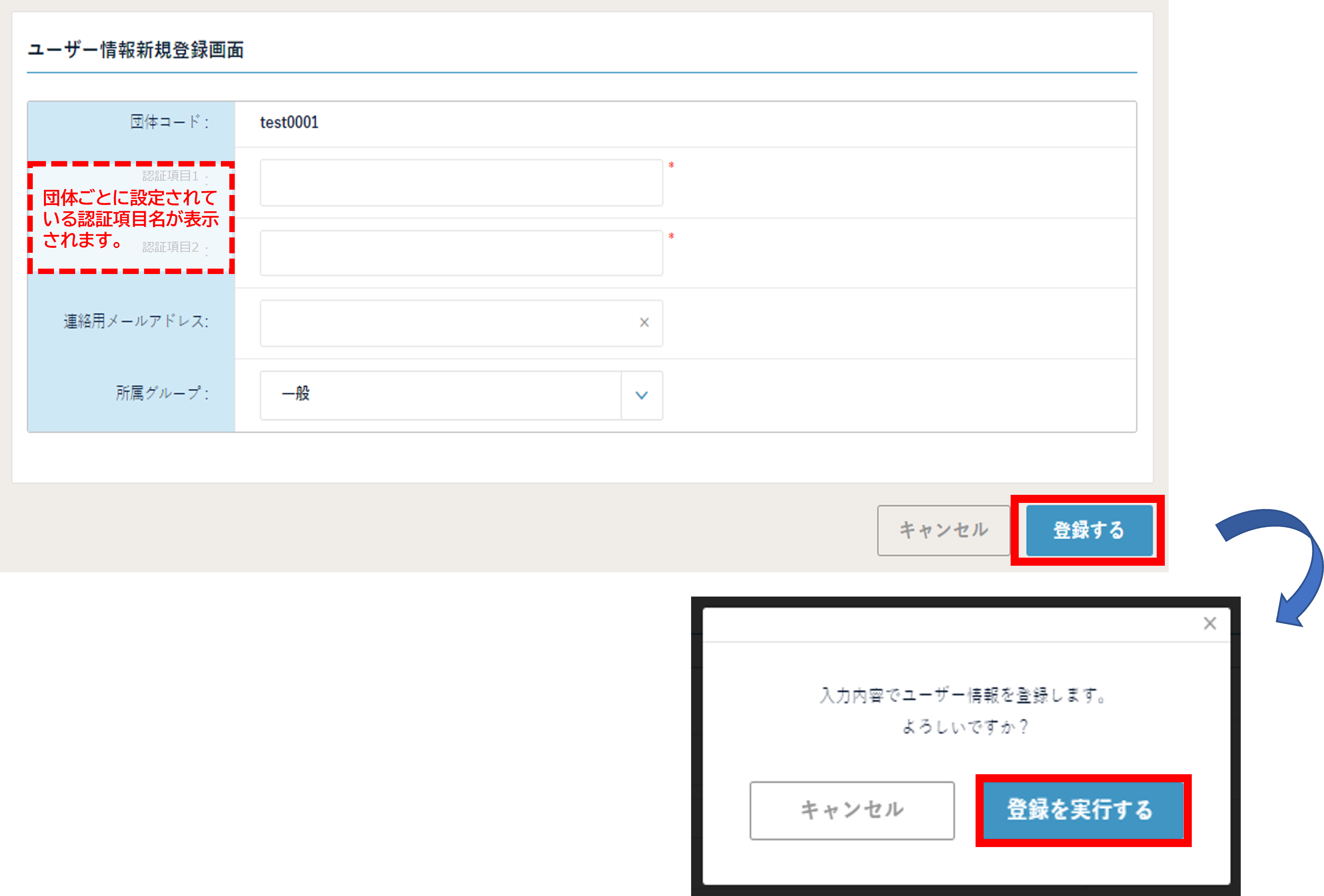 上記画面の「(A) 認証用ユーザー情報の追加 」からユーザー情報を入力後、「登録する>登録を実行する」を押してください。
