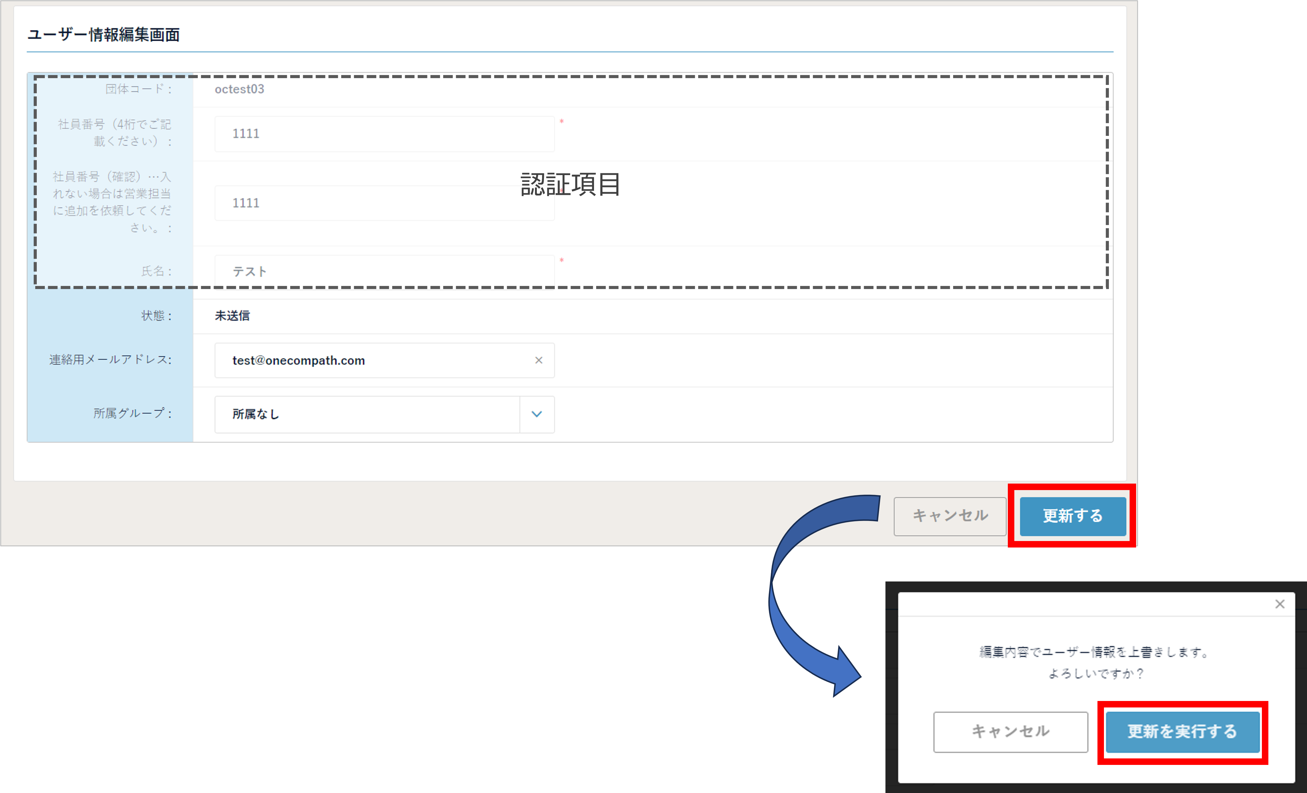 上記画面の「(B) 編集 」からユーザー情報を編集後、「更新する>更新を実行する」を押してください。