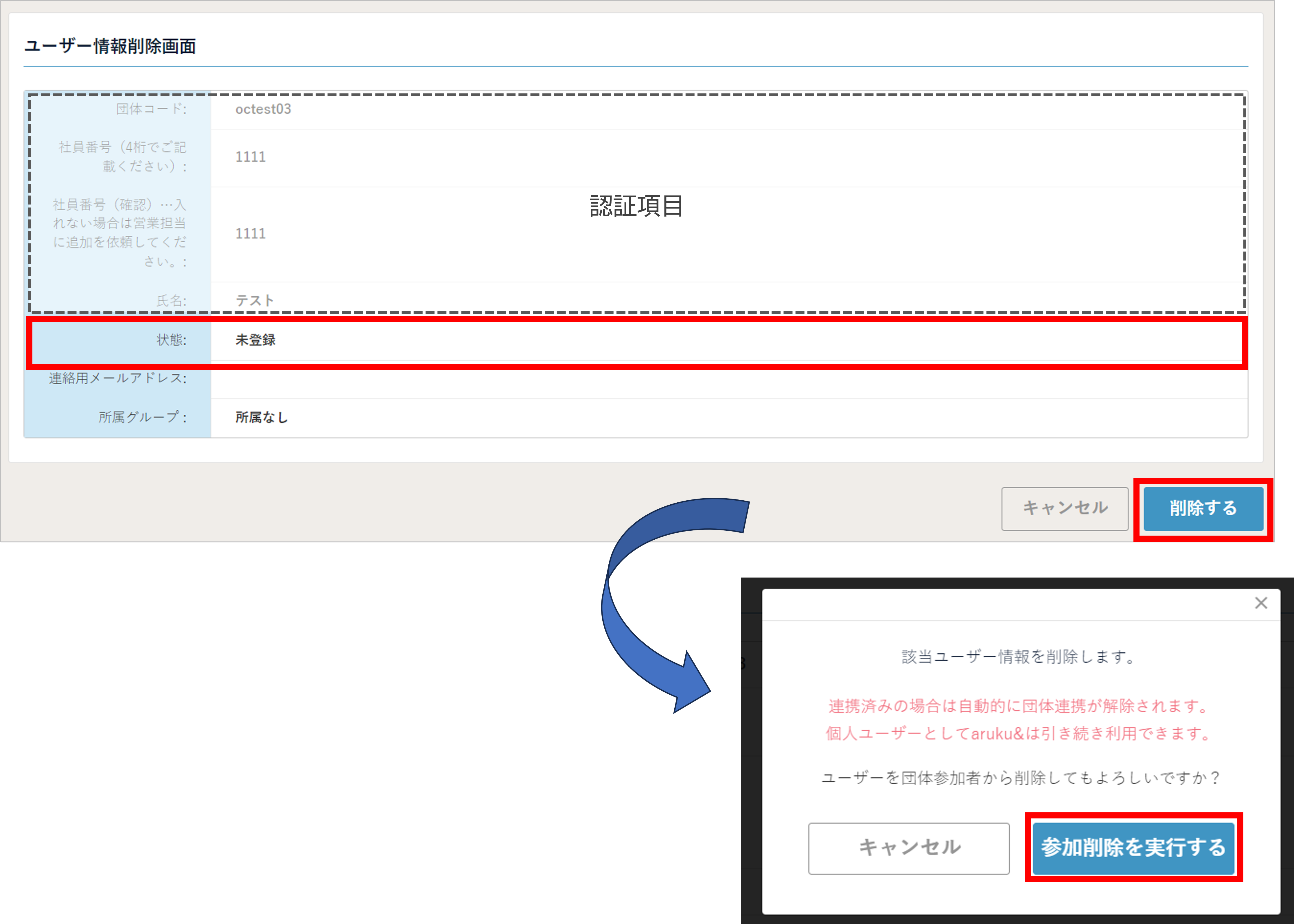 ※ 認証前(団体未参加)のユーザーも一律で「参加削除を実行する」のダイアログが表示されます。